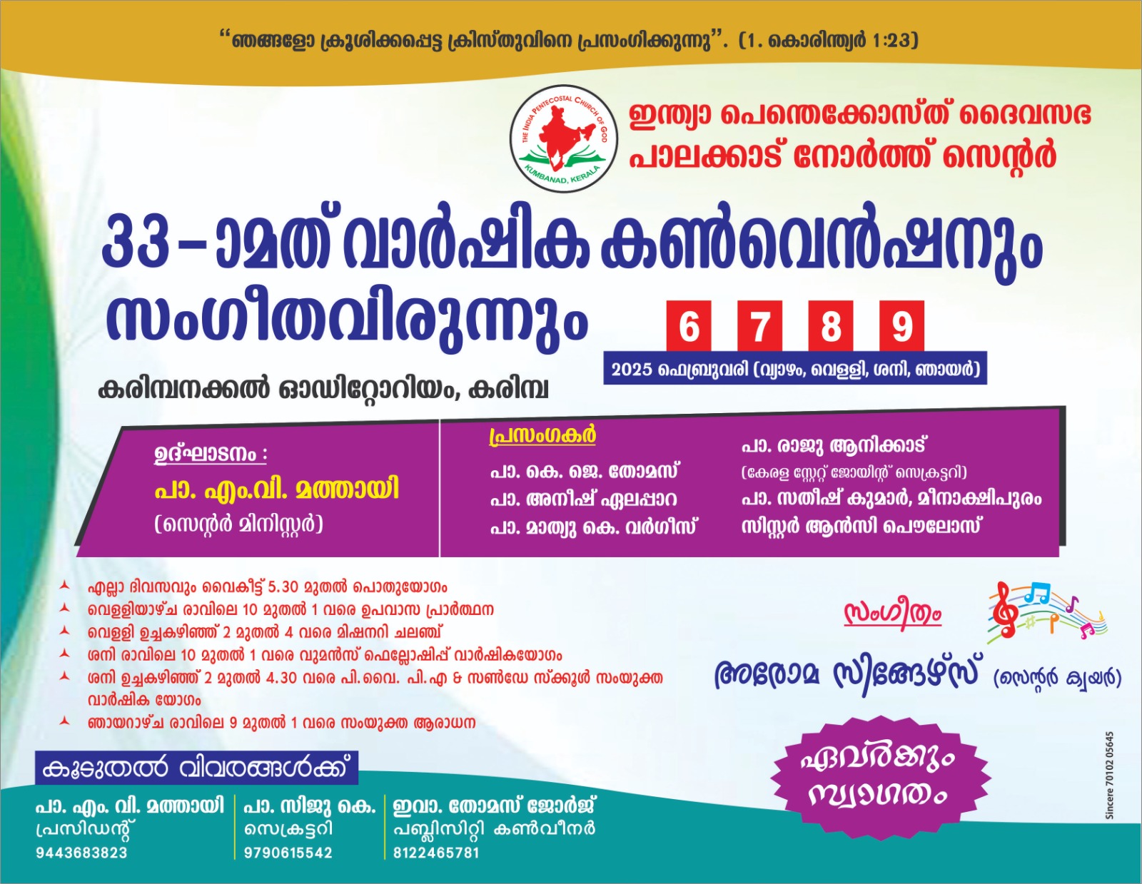 തുപ്പനാട് : ഐപിസി പാലക്കാട് നോർത്ത് സെൻ്റർ 33- മത് വാർഷിക കൺവൻഷൻ ഫെബ്രുവരി 6 മുതൽ 9 വരെ തുപ്പനാട് (കല്ലടിക്കോട്, പാലക്കാട്) കരിമ്പനക്കൽ ഓഡിറ്റോറിയത്തിൽ നടക്കും. സെൻ്റർ മിനിസ്റ്റർ പാ. എം.വി. മത്തായി ഉദ്ഘാടനം നിർവഹിക്കും.