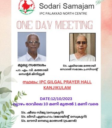 പാലക്കാട് : ഐപിസി പാലക്കാട് നോർത്ത് സെൻ്റർ സോദരി സമാജം ഏകദിന സമ്മേളനം കാഞ്ഞിക്കുളം ഗിൽഗാൽ സഭയിൽ ഒക്ടോബർ 12 വ്യാഴാഴ്ച രാവിലെ 10 മണി മുതൽ നടക്കും. സെൻ്റർ മിനിസ്റ്റർ പാസ്റ്റർ എം. വി. മത്തായി മുഖ്യ സന്ദേശം നൽകും. ഏലിയാമ്മ മത്തായി (പ്രസിഡൻ്റ് ), ഷീബ സിജു (സെക്രട്ടറി), ലിസി എബ്രഹാം (ജോയിൻ്റ് സെക്രട്ടറി), ലൗസി നെബു മാത്സൻ (ട്രഷറർ) എന്നിവർ നേതൃത്വം നൽകും.