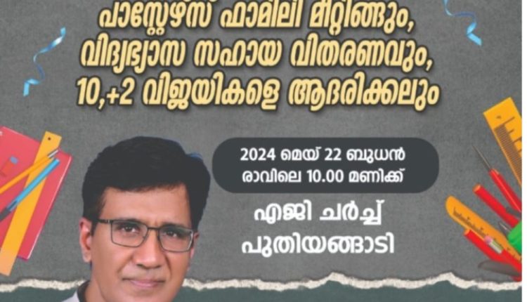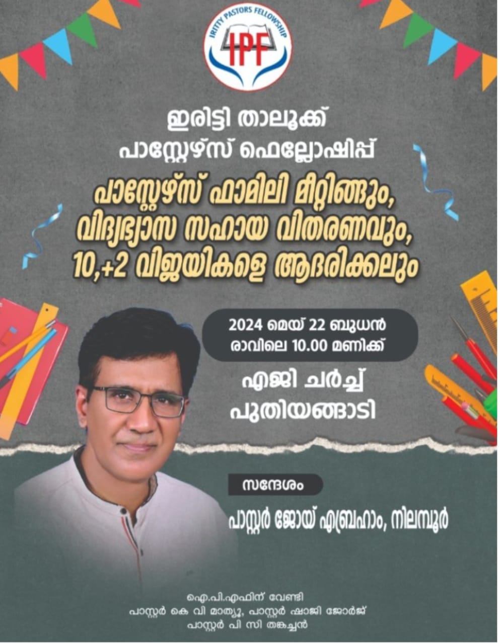 കണ്ണൂർ : ഐപിസി പാസ്റ്റേഴ്സ് ഫെല്ലോഷിപ്പ് ഇരിട്ടി താലൂക്കിന്റെ കുടുംബ സംഗമവും പത്താം ക്ലാസ്സിലും, പന്ത്രണ്ടാം ക്ലാസ്സിലും വിജയികളായ ദൈവദാസൻമാരുടെ മക്കളെ ആദരിക്കുകയും, താലൂക്കിലെ പാസ്റ്റർമാരുടെ മകൾക്ക് വിദ്യാഭ്യാസ സഹായ വിതരണവും മെയ് 22 ബുധനാഴ്ച രാവിലെ 10 മുതൽ പുതിയങ്ങാടി എ.ജി ഹാളിൽ നടക്കും. പാ. കെ.വി മാത്യു, സെക്രട്ടറി പാ. ഷാജി ജോർജ്, ട്രഷറർ പാ. പി.സി തങ്കച്ചൻ, പാ. ജോമോൻ ജോസഫ് എന്നിവർ നേതൃത്വം നൽകും.