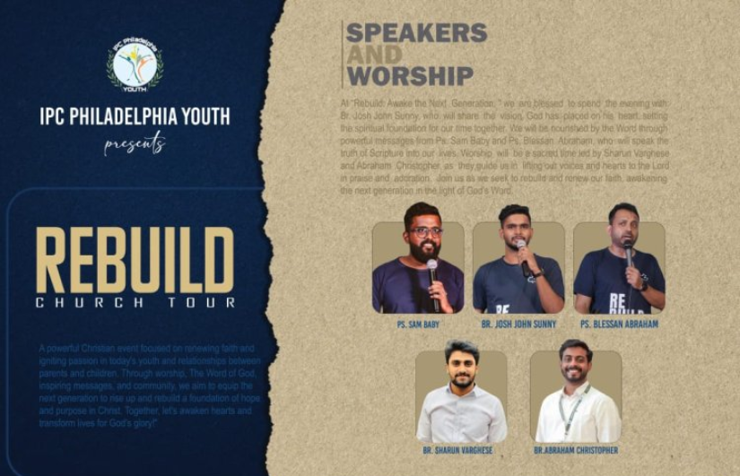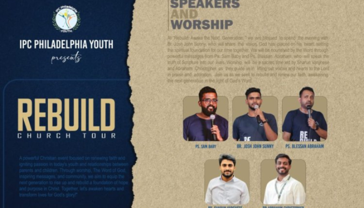 കോട്ടയം : ഐപിസി ഫിലാഡൽഫിയ യൂത്തിന്റെ ആഭിമുഖ്യത്തിൽ ആഗസ്റ്റ് 24 വൈകിട്ട് കോട്ടയം കഞ്ഞിക്കുഴി ഐപിസി ഫിലദൽഫിയ ഹാളിൽ റീബിൽഡ് എന്ന ക്രിസ്തീയ യുവജന കൂട്ടായ്മയും സംഗീത സന്ധ്യയും നടക്കും.