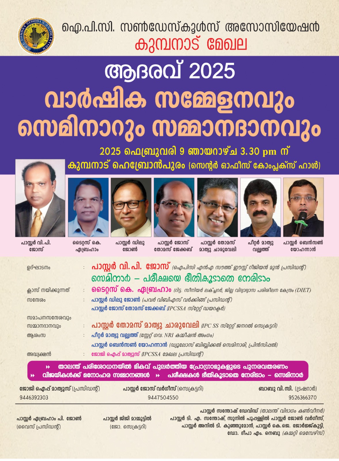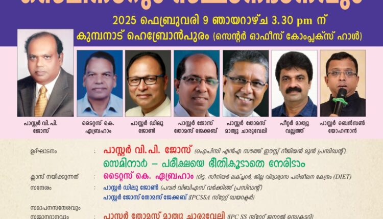 കുമ്പനാട്: ഐപിസി സൺഡേസ്കൂൾസ് അസോസിയേഷൻ മേഖല സമ്മേളനവും സെമിനാറും സമ്മാനദാനവും നാളെ (9/2/2025 ഞായർ) 3.30ന് സഭാ ആസ്ഥാനമായ ഹെബ്രോൻപുരത്തുള്ള സെൻട്രൽ ഹാളിൽ നടക്കും.