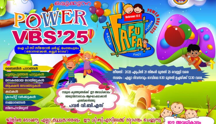 ഐപിസി സൺഡേ സ്കൂൾ അസോസിയേഷൻ ആറ്റിങ്ങൽ സെന്റർ വി.ബി.എസ് ChristianNews On Apr 21, 2025 639 മംഗലപുരം : ഐപിസി സൺഡേ സ്കൂൾ അസോസിയേഷൻ ആറ്റിങ്ങൽ സെന്ററിന്റെ ആഭിമുഖ്യത്തിൽ മംഗലപുരം ഐപിസി സീയോൻ ചർച്ചിൽ ഇന്ന് രാവിലെ 8:30 ഉച്ചയ്ക്ക് 12:30 വരെ വെക്കേഷൻ ബൈബിൾ സ്കൂൾ നടക്കുന്നു. വിബിഎസിൽ കഥകൾ, ആക്ഷൻ സോങ് തുടങ്ങിയവ നടക്കും 639 Share