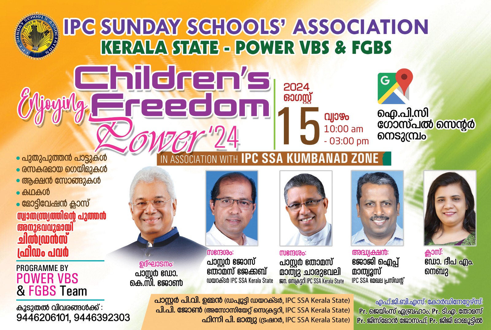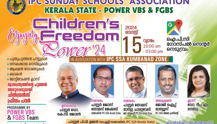 തിരുവല്ല: ഐപിസി സൺഡേസ്കൂൾസ് അസോസിയേഷൻ സംസ്ഥാന ചിൽഡ്രൻസ് ഫ്രീഡം പവർ കോൺഫറൻസ് 15ന് രാവിലെ പത്തിന് നെടുമ്പ്രം ഐപിസി ഗോസ്പൽ സെൻ്ററിൽ നടക്കും. ഐപിസി മുൻ ജനറൽ പ്രസിഡൻ്റ് പാസ്റ്റർ ഡോ. കെ. സി. ജോൺ ഉദ്ഘാടനം ചെയ്യും. മേഖല പ്രസിഡൻ്റ് ജോജി ഐപ്പ് മാത്യൂസ് അധ്യക്ഷത വഹിക്കും.