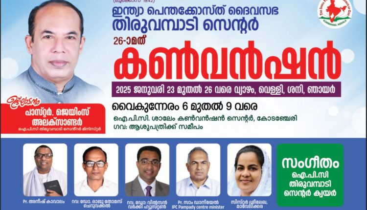 കോടഞ്ചേരി : ഐപിസി തിരുവമ്പാടി സെന്ററിന്റെ ആഭിമുഖ്യത്തിൽ ജനുവരി 23 മുതൽ 26 വരെ കോടഞ്ചേരി ഐപിസി ശാലേം കൺവൻഷൻ സെൻ്ററിൽ 26 -മത് കൺവൻഷൻ നടക്കും. പാ. ജെയിംസ് അലക്സാണ്ടർ ഉദ്‌ഘാടനം നിർവഹിക്കും.