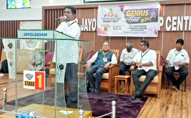 നാലാഞ്ചിറ : ശനിയാഴ്ച ഐപിസി തിരുവനന്തപുരം മേഖലാ പിവൈപിഎയുടെ ആഭിമുഖ്യത്തിൽ ഐ.പി.സി ജയോത്സവം വർഷിപ്പ് സെൻ്ററിൽ താലന്ത് പരിശോധന നടന്നു. പാ. ദിലു ജോൺ ഉദ്‌ഘാടനം നിർവഹിച്ചു.