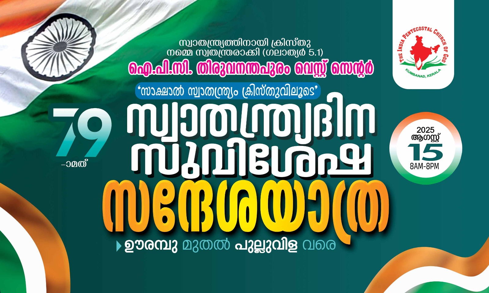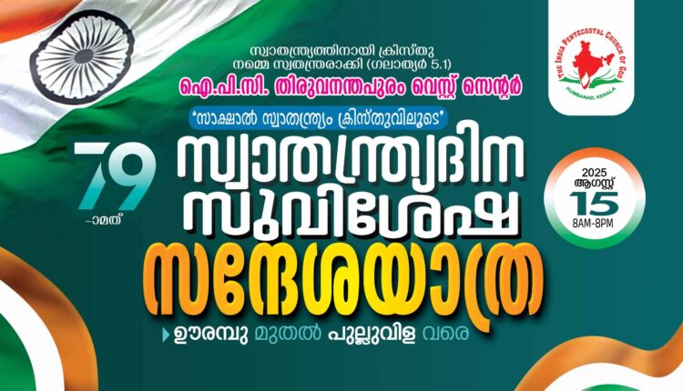 ഐപിസി തിരുവനന്തപുരം വെസ്റ്റ് സെന്റർ സ്വാതന്ത്ര്യദിന സുവിശേഷ സന്ദേശയാത്ര ഊരമ്പു മുതൽ ChristianNews Last updated Aug 12, 2025 438 തിരുവനന്തപുരം : ഐപിസി തിരുവനന്തപുരം വെസ്റ്റ് സെന്ററിന്റെ ആഭിമുഖ്യത്തിൽ august 15 വെള്ളിയാഴ്ച ഊരമ്പു മുതൽ പുല്ലുവിള വരെ 79 -മത് സ്വാതന്ത്ര്യദിന സുവിശേഷ സന്ദേശയാത്ര നടക്കും. 438 Share