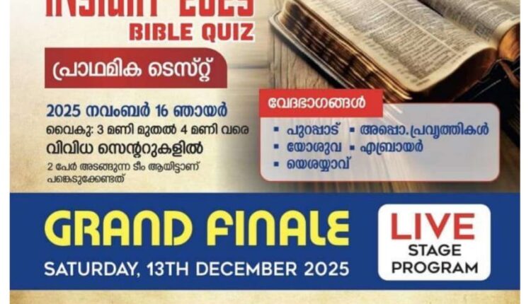 കോഴിക്കോട് : ഇന്റെൻസീവ് പ്രെയർ ഫെല്ലോഷിപ്പ് (IPF ) ഒരുക്കുന്ന ഇൻസൈറ്റ് -2025 ബൈബിൾ ക്വിസിന്റെ പ്രിലിമിനറി റൗണ്ട് നവംബർ 16 ഞായറാഴ്ച ഉച്ചക്ക് ശേഷം
