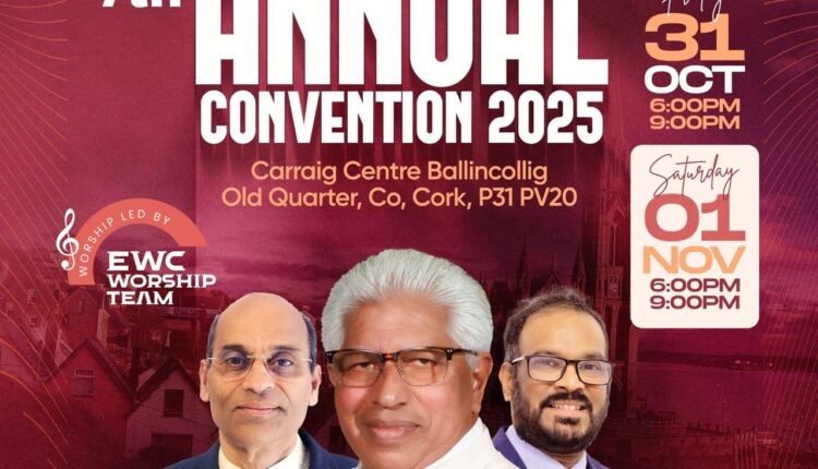 ദൈവകൃപയാൽ, അയർലൻഡ് കോർക്ക് എബനേസർ ചർച്ച്ന്റ 7-മത് വാർഷിക കൺവെൻഷനും യുവജന സമ്മേളനവും ഒക്ടോബർ 31 മുതൽ നവംബർ 2 വരെ കാർറൈഗ് സെന്റർ, ബാളിങ്കോളിക്-ൽ വച്ചു നടത്തപ്പെടുന്നു.