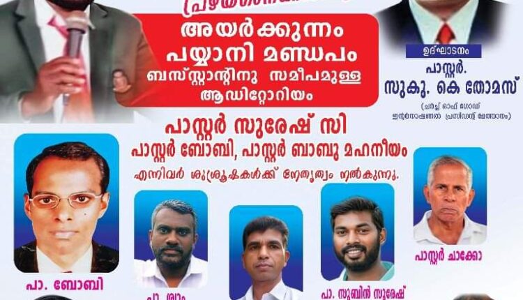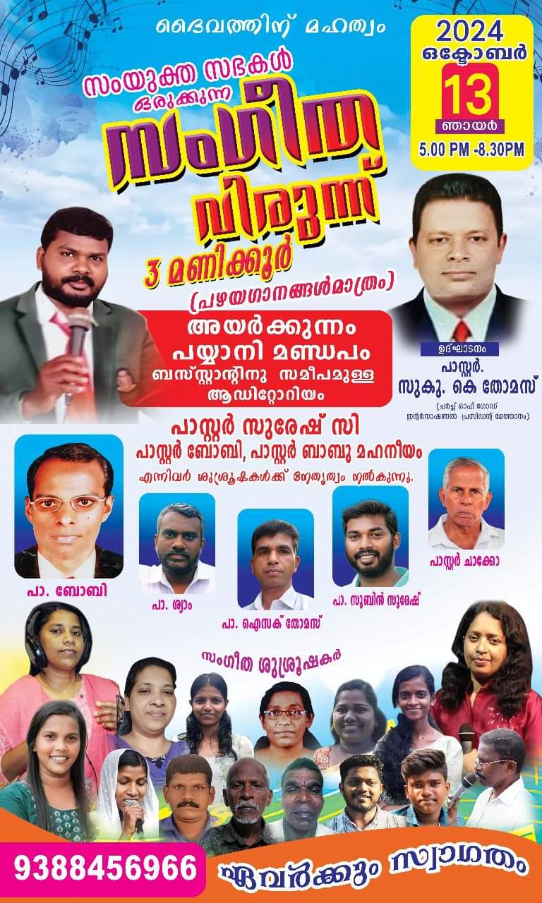 അയർക്കുന്നം : സംയുക്ത സഭകളുടെ ആഭിമുഖ്യത്തിൽ ഒക്ടോബർ 13 ന് അയർക്കുന്നം പയ്യാനി മണ്ഡപം ബസ്സ്റ്റാൻ്റിനു സമീപമുള്ള ആഡിറ്റോറിയത്തിൽ സംഗീത വിരുന്ന് നടക്കും.