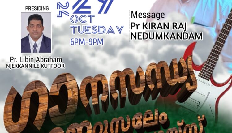 ജെറുസലേം ഗോസ്പൽ മിഷൻ തൊടുപുഴ ഗാന സന്ധ്യ ChristianNews On Oct 19, 2024 54 തിരുവല്ല : ജെറുസലേം ഗോസ്പൽ മിഷൻ തൊടുപുഴയുടെ ആഭിമുഖ്യത്തിൽ ഒക്ടോബർ 29 ന് തിരുവല്ല കുറ്റൂർ ന്യൂ ഇന്ത്യ ചർച്ച് ഓഫ് ഗോഡ് ഓഡിറ്റോറിയത്തിൽ ഗാന സന്ധ്യ നടക്കും. പാ. ലിബിൻ എബ്രഹാം നേതൃത്വം നൽകും. 54 Share