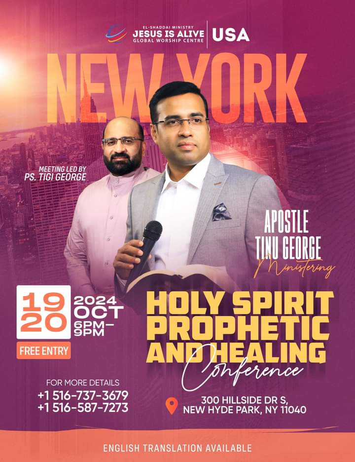 ഡാളസ് : എൽ ഷദ്ദായി മിനിസ്ട്രി ജീസസ് ഈസ് എലൈവ് ഗ്ലോബൽ വർഷിപ് സെന്ററിന്റെ ആഭിമുഖ്യത്തിൽ ഒക്ടോബർ 19 നും 20 നും 300 ഹിൽസൈഡ് ഡിആർഎസ്, ന്യൂ ഹൈഡ് പാർക്ക്, എൻവൈ 11040ൽ ഡെലിവെറൻസ് മീറ്റിംഗ് നടക്കും. പാ. ടിനു ജോർജ് പ്രസംഗിക്കും. പാ. ടിജി ജോർജ് നേതൃത്വം നൽകും.