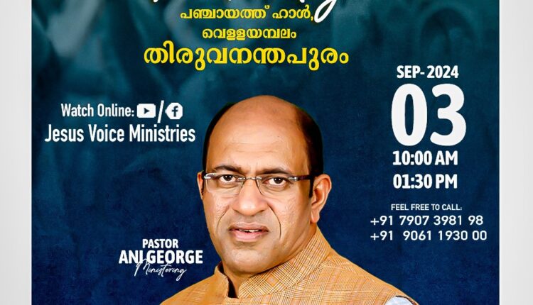 തിരുവനന്തപുരം : ജീസസ് വോയിസ് മിനിസ്ട്രിയുടെ ആഭിമുഖ്യത്തിൽ സെപ്റ്റംബർ 3 ന് തിരുവനന്തപുരം വെള്ളയമ്പലം പഞ്ചായത്ത് ഹാളിൽ ഡെലിവെറൻസ് മീറ്റിംഗ് നടക്കും. പാ. അനി ജോർജ് പ്രസംഗിക്കും.