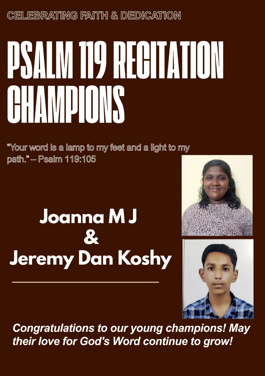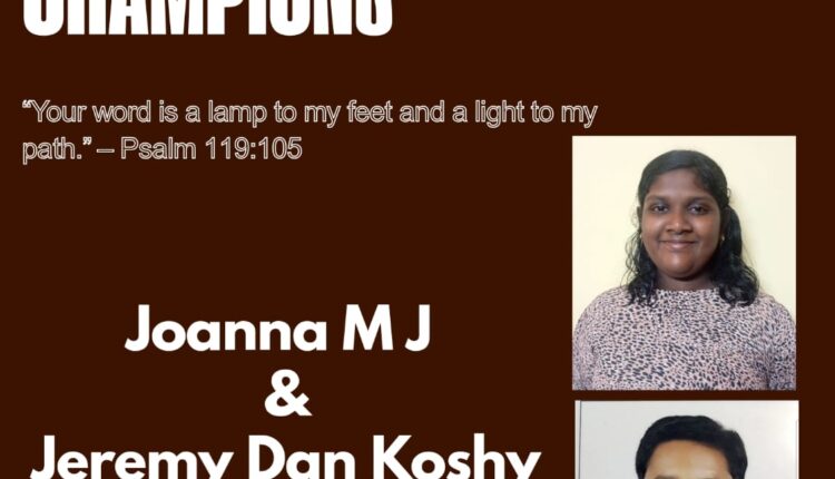 ബെംഗളൂരു: 119-ാം സങ്കീർത്തനം മന:പാoമാക്കി എം ജെ ജോയാനയും, ജെറമി ഡാൻ കോശിയും ശ്രദ്ധേയരായി. ശാന്തിനഗർ ശാലേം