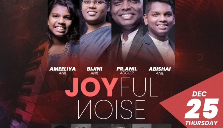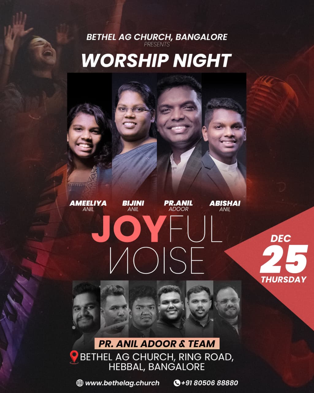 ബാംഗ്ലൂർ: ബാംഗ്ലൂർ ബെഥേൽ എ.ജി.യുടെ (Bethel AG) ആഭിമുഖ്യത്തിൽ ‘ജോയ്ഫുൾ നോയ്സ്’ (Joyful Noise) എന്ന പേരിൽ വിപുലമായ സംഗീത ആരാധന സംഘടിപ്പിക്കുന്നു. ഡിസംബർ 25 വൈകുന്നേരം 5 മണിക്ക് ബാംഗ്ലൂരിലെ ആരാധനാലയത്തിൽ വെച്ചാണ് യോഗം ക്രമീകരിച്ചിരിക്കുന്നത്.