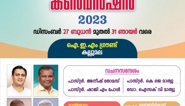 മാവേലിക്കര : ദി ചർച്ച് ഓഫ് ഗോഡ് (കല്ലുമല) ദൈവസഭയുടെ ജനറൽ കൺവെൻഷൻ ഡിസംബർ 27 മുതൽ 31 വരെ കല്ലുമല ഐഇഎം ഗ്രൗണ്ടിൽ നടക്കും. രാത്രി യോഗങ്ങൾ വൈകുന്നേരം 5.30 മുതൽ 9 വരെയും സംയുക്ത ആരാധന ഞായറാഴ്ച രാവിലെ 8.30 നും നടക്കും.