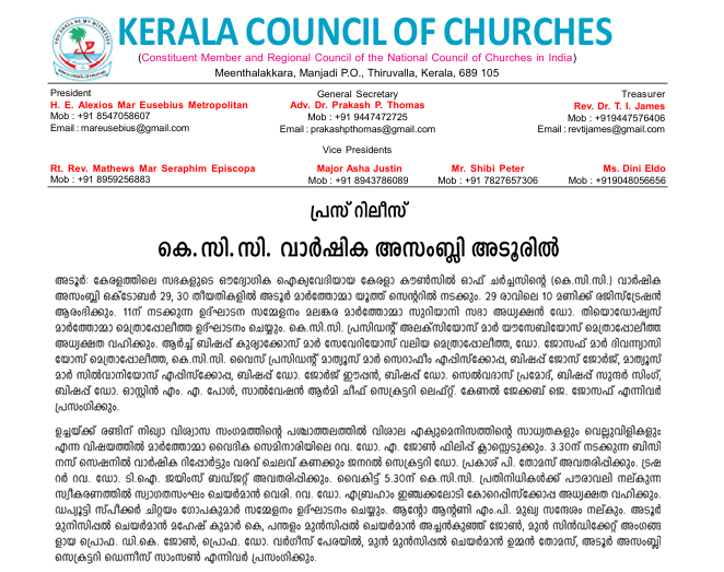 അടൂര്: കേരളത്തിലെ സഭകളുടെ ഔദ്യോഗിക ഐക്യവേദിയായ കേരളാ കൗണ്സില് ഓഫ് ചര്ച്ചസിന്റെ (കെ.സി.സി.) വാര്ഷിക അസംബ്ലി ഒക്ടോബര് 29, 30 തീയതികളില് അടൂര് മാര്ത്തോമ്മാ യൂത്ത് സെന്ററില് നടക്കും. 29 രാവിലെ 10 മണിക്ക് രജിസ്ട്രേഷന് ആരംഭിക്കും. 11ന് നടക്കുന്ന ഉദ്ഘാടന സമ്മേളനം മലങ്കര മാര്ത്തോമ്മാ സുറിയാനി സഭാ അധ്യക്ഷന് ഡോ. തിയൊഡോഷ്യസ് മാര്ത്തോമ്മാ മെത്രാപ്പോലീത്ത ഉദ്ഘാടനം ചെയ്യും. കെ.സി.സി. പ്രസിഡന്റ് അലക്സിയോസ് മാര് യൗസേബിയോസ് മെത്രാപ്പോലീത്ത അധ്യക്ഷത വഹിക്കും. ആര്ച്ച് ബിഷപ്പ് കുര്യാക്കോസ് മാര് സേവേറിയോസ് വലിയ മെത്രാപ്പോലീത്ത, ഡോ. ജോസഫ് മാര് ദിവന്ന്യാസിയോസ് മെത്രാപ്പോലീത്ത, കെ.സി.സി. വൈസ് പ്രസിഡന്റ് മാത്യൂസ് മാര് സെറാഫീം എപ്പിസ്ക്കോപ്പ, ബിഷപ്പ് ജോസ് ജോര്ജ്, മാത്യൂസ് മാര് സില്വാനിയോസ് എപ്പിസ്ക്കോപ്പ, ബിഷപ്പ് ഡോ. ജോര്ജ് ഈപ്പന്, ബിഷപ്പ് ഡോ. സെല്വദാസ് പ്രമോദ്, ബിഷപ്പ് സുന്ദര് സിംഗ്, ബിഷപ്പ് ഡോ. ഓസ്റ്റിന് എം. എ. പോള്, സാല്വേഷന് ആര്മി ചീഫ് സെക്രട്ടറി ലെഫ്റ്റ്. കേണല് ജേക്കബ് ജെ. ജോസഫ് എന്നിവര് പ്രസംഗിക്കും.