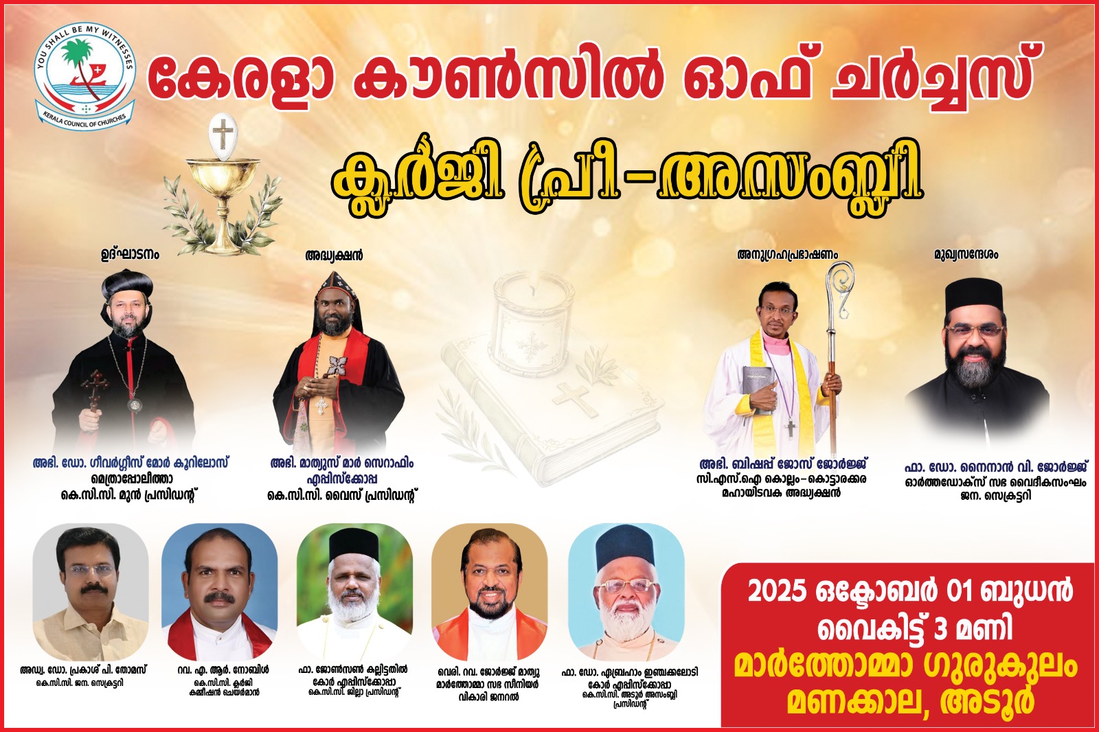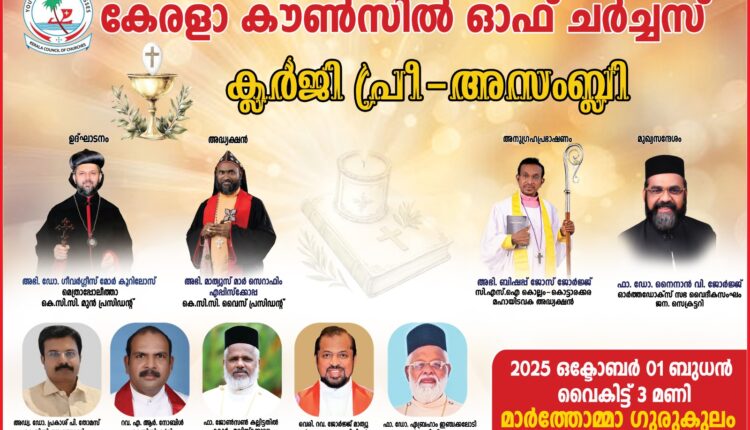 അടൂർ: കേരളാ കൗൺസിൽ ഓഫ് ചർച്ചസ് സംസ്ഥാന വാർഷിക അസംബ്ലിക്ക് മുന്നോടിയായി നടത്തുന്ന ക്ലർജി പ്രീ അസംബ്ലി ഒക്ടോബർ 1 ന് അടൂർ മണക്കാല മാർത്തോമ്മാ ഗുരുകുലത്തിൽ നടക്കും. മാത്യൂസ് മാർ സെറാഫിം എപ്പിസ്കോപ്പ അധ്യക്ഷത വഹിക്കും.