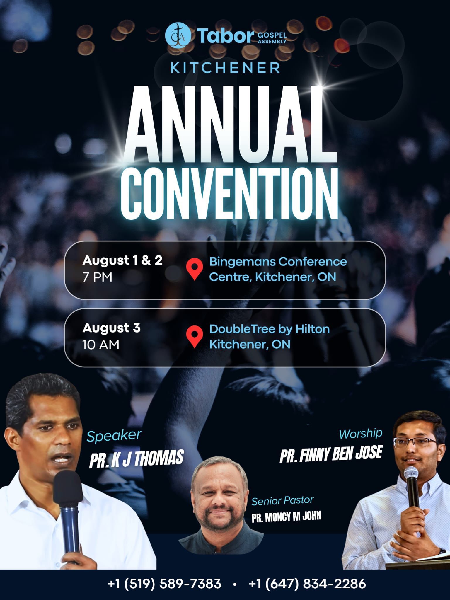 ഒന്റാറിയോ, കാനഡ: കിച്ചെനർ താബോർ ഗോസ്പൽ അസംബ്ലി വാർഷിക കൺവെൻഷൻ-2025, ഓഗസ്റ്റ് 1 വെള്ളി മുതൽ 3 ഞായർ വരെ നടക്കുന്നു. വെള്ളി ശനി ദിവസങ്ങളിൽ കിച്ചെനർ ബിംഗെമൻസ് കോൺഫറൻസ് സെന്ററിൽ വെച്ചും, മൂന്നാം തീയതി ഞായറാഴ്ച കിച്ചെനർ ഹിൽട്ടൻ ഡബിൾ ട്രീ ഹോട്ടലിൽ വെച്ചും നടത്തപ്പെടുന്നു.