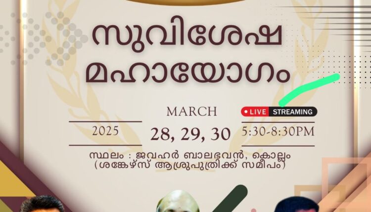 കൊല്ലം: അസംബ്ലീസ് ഓഫ് ഗോഡ് കൊല്ലം സഭയുടെ വജ്ര ജൂബിലിയോട് അനുബന്ധിച്ച് മാർച്ച് 28 മുതൽ 30 വരെ കൊല്ലം ജവഹർ ബാലഭവനിൽ സുവിശേഷ മഹാ യോഗവും സംഗീത വിരുന്നും നടക്കും.