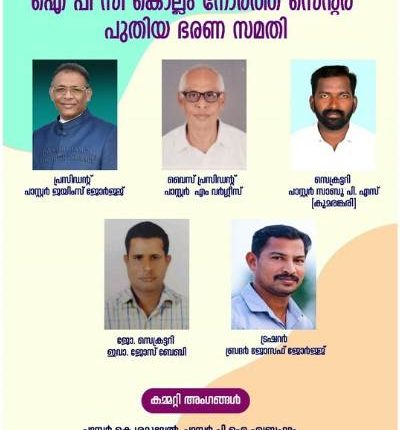 കൊല്ലം : കൊല്ലം ഐപിസി നോർത്ത് സെന്ററിന് പുതിയ ഭാരവാഹികളെ തിരഞ്ഞെടുത്തു. പാ. ജെയിംസ് ജോർജ്ജ് പ്രസിഡന്റ്, പാ. എം വർഗ്ഗീസ് വൈസ് പ്രസിഡന്റ് , ഇവാഞ്ചലിസ്റ്റ് സാബു കുമരങ്കരി സെക്രട്ടറി, ഇവാഞ്ചലിസ്റ്റ് ജോസ് ബേബി ജോയിന്റ് സെക്രട്ടറി , ജോസഫ് ജോർജ്ജ് ട്രഷറാർ എന്നിവരെ കൂടാതെ കമ്മറ്റി അംഗങ്ങളായി പാസ്റ്റർമാരായ കെ ശമുവേൽ,ജെ ജോയി, സാന്റി മാതും,പി.ഐ എബ്രഹാം, ജയ്സൺ.റ്റി