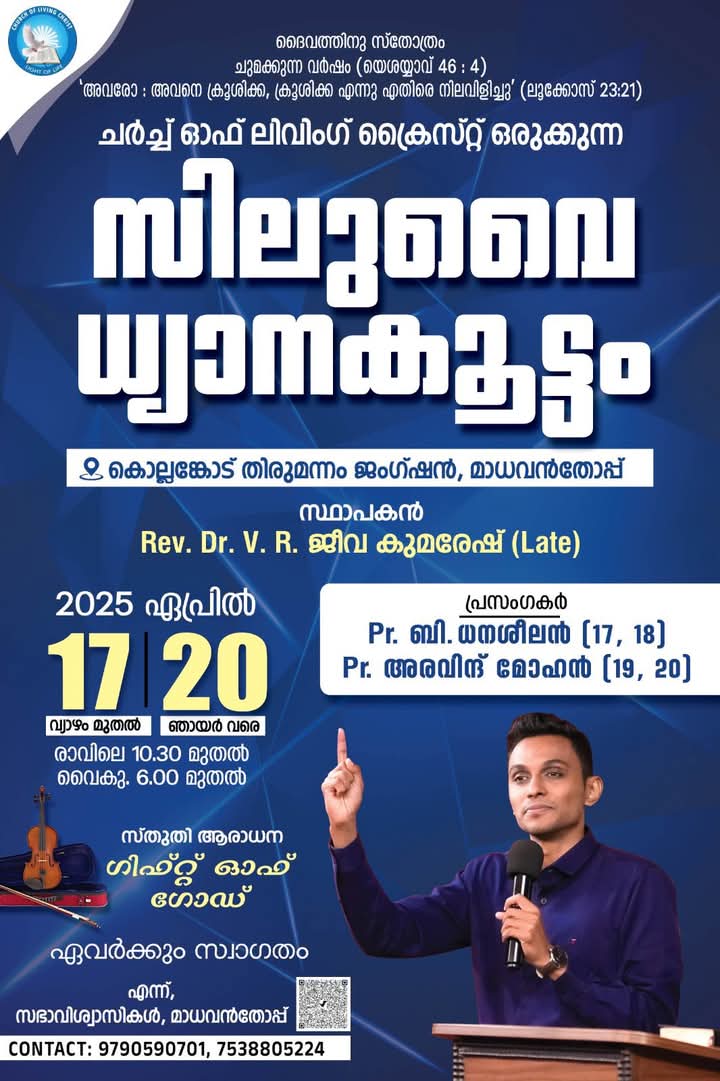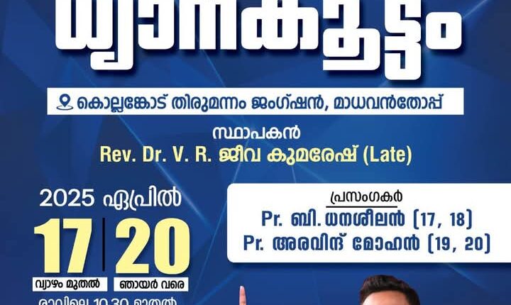 കൊല്ലങ്കോട് : ചർച്ച് ഓഫ് ലിവിങ് ക്രൈസ്റ്റ് മിനിസ്ട്രിയുടെ ആഭിമുഖ്യത്തിൽ ഏപ്രിൽ 17 മുതൽ 20 വരെ കൊല്ലങ്കോട് തിരുമന്നം ജംഗ്ഷനിൽ ഉണർവ് യോഗം നടക്കും. പാ. ബി ധനശീലൻ, പാ. അരവിന്ദ് മോഹൻ എന്നിവർ പ്രസംഗിക്കും. ഗിഫ്റ്റ് ഓഫ് ഗോഡ് ഗാന ശുശ്രൂഷ നിർവഹിക്കും.
