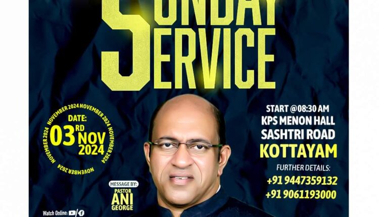 കോട്ടയം : ജീസസ് വോയിസ് മിനിസ്ട്രീസിന്റെ ആഭിമുഖ്യത്തിൽ ഞായറാഴ്ച കോട്ടയം കെപിഎസ് മേനോൻ ഹാളിൽ ഹോളി സൺഡേ സർവീസ് നടക്കും. പാ. അനി ജോർജ് പ്രസംഗിക്കും. പാ. ജോഷി ജോൺ നേതൃത്വം നൽകും. പാ. ലാലു ദേവ്, ബ്രദർ കെനസ് ജെ മാത്യു, ബ്രദർ മോൻസി അലക്സാണ്ടർ എന്നിവർ ഗാന ശുശ്രുഷ നയിക്കും.