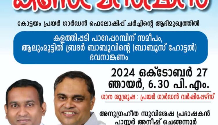 കോട്ടയം : കോട്ടയം പ്രയർ ഗാർഡൻ ഫെലോഷിപ്പ് ചർച്ചിൻ്റെ ആഭിമുഖ്യത്തിൽ ഒക്ടോബർ 27 ന് കളത്തിപ്പടി പാറേപ്പറമ്പിന് സമീപം, ആലുംമൂട്ടിൽ ബ്രദർ ബാബുവിൻ്റെ (ബാബൂസ് ഹോട്ടൽ) ഭവനാങ്കണത്തിൽ മുറ്റത്ത് കൺവെൻഷൻ നടക്കും.