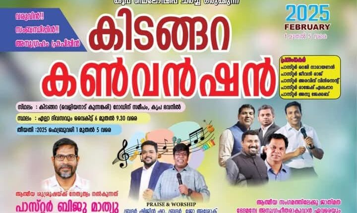 കിടങ്ങറ : കൃപ ഫെലോഷിപ്പ് ചർച്ച് ഒരുക്കുന്ന കിടങ്ങറ കൺവൻഷൻ ഫെബ്രുവരി 1 മുതൽ 5 വരെ കിടങ്ങറ (വെളിയനാട് കുന്നങ്കരി) റോഡിന് സമീപം, കൃപ ഭവനിൽ നടക്കും.