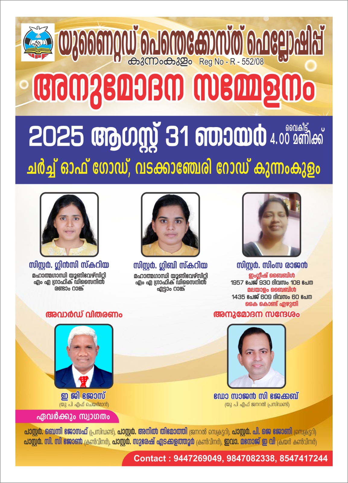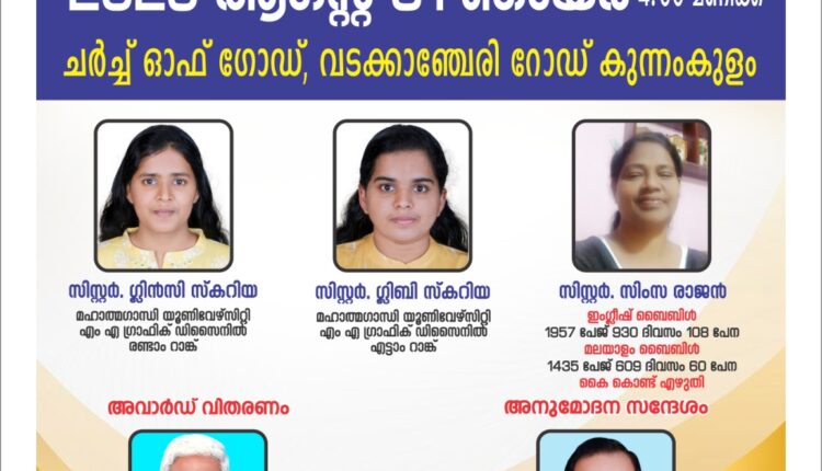 കുന്നംകുളം: യു പി എഫ് കുന്നംകുളത്തിൻ്റെ അഭിമുഖ്യത്തിൽ ആഗസ്റ്റ് 31 ഞായറാഴ്ച നാലു മണിക്ക് വടക്കാഞ്ചേരി റോഡിലുള്ള ചർച്ച് ഓഫ് ഗോഡ് ഹാളിൽ വെച്ച് ജനറൽ സെക്രട്ടറി പാസ്റ്റർ: അനിൽ തിമോത്തിയുടെ അദ്യക്ഷതയിൽ കൂടുന്ന സമ്മേളത്തിൽ വെച്ച് മഹാത്മഗാന്ധി സർവ്വകലാശാലയിൽ നിന്ന് എം.എ ഗ്രാഫിക് ഡിസൈനിൽ രണ്ടാം റാങ്ക് നേടിയ സിസ്റ്റർ:ഗ്ലിൻസി സ്കറിയക്കും, എട്ടാം റാങ്ക് നേടിയ സിസ്റ്റർ:ഗ്ലിബി സ്കറിയക്കും,ഇംഗ്ലീഷ് ബൈബിൾ (1957 പേജ് 930 ദിവസം 108 പേന) മലയാളം ബൈബിൾ (1435 പേജ് 609 ദിവസം 60 പേന) കൈ കൊണ്ട് എഴുതി കഴിവ് തെളിയിച്ച സിസ്റ്റർ സിംസ രാജനുമുള്ള അവാർഡ് വിതരണം യ.പി.എഫ് ചെയർമാൻ പാസ്റ്റർ: ഇ. ജി ജോസ് നിർവ്വഹിക്കും. യു.പി എഫ് ജനറൽ പ്രസിഡണ്ട് ഡോ: സാജൻ സി. ജേക്കബ് അനുമോദന സന്ദേശം നൽകും. യു പി എഫ് സോണൽ പ്രസിഡണ്ട് പാസ്റ്റർ: ബെന്നി ജോസഫ്, സെക്രട്ടറി പാസ്റ്റർ: പി ജെ ജോണി, കോർഡിനേറ്റർമാരായ പാസ്റ്റർ: സുരേഷ് എടക്കളത്തൂർ, പാസ്റ്റർ: സി.സി.ജോൺ എന്നിവർ നേതൃത്വം നൽകും.