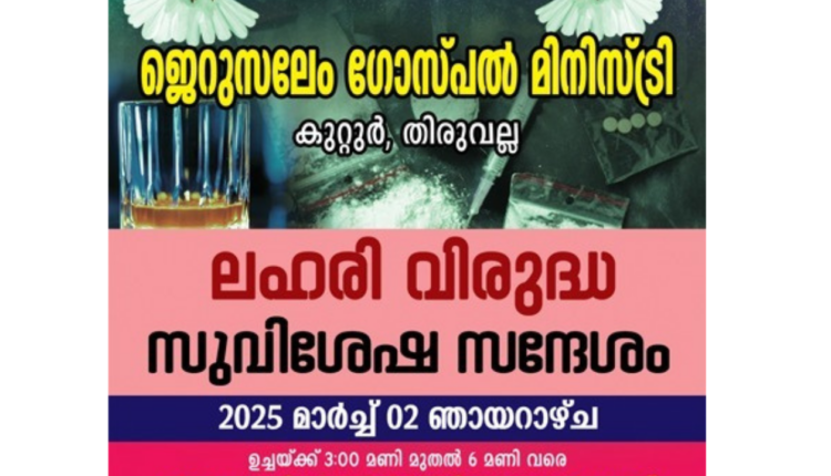 കുറ്റൂർ ജെറുസലേം ഗോസ്പൽ മിനിസ്ട്രി ലഹരി വിരുദ്ധ സുവിശേഷ സന്ദേശ യാത്ര ChristianNews On Feb 24, 2025 194 തിരുവല്ല : കുറ്റൂർ ജെറുസലേം ഗോസ്പൽ മിനിസ്ട്രിയുടെ ആഭിമുഖ്യത്തിൽ മാർച്ച് 2 ന് കുറിയന്നൂർ, തോണിപ്പുഴ, ചരൽക്കുന്ന് എന്നിവിടങ്ങളിൽ ലഹരി വിരുദ്ധ സുവിശേഷ സന്ദേശ യാത്ര നടക്കും. ക്വയർ ടീം ഗാനങ്ങൾ ആലപിക്കും 194 Share