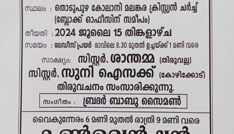 തൊടുപുഴ : മലപ്പുറം കോട്ടയ്ക്കൽ വിശ്വാസയാത്ര മിനിസ്ട്രിയുടെ ആഭിമുഖ്യത്തിൽ ജൂലൈ 15 ന് തൊടുപുഴ കോലാനി മലങ്കര ക്രിസ്ത്യൻ ചർച്ചിൽ രാവിലെ ലേഡീസ് ഫെല്ലോഷിപ്പും വൈകിട്ട് ഏകദിന കൺവെൻഷനും നടക്കും.