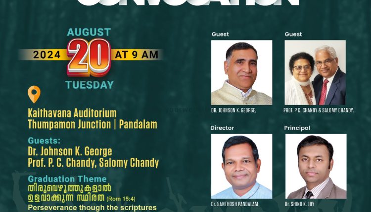 പന്തളം : ലാൻഡ് വേ തിയോളജിക്കൽ സെമിനാരിയുടെ ആഭിമുഖ്യത്തിൽ പന്തളം തുമ്പമൺ ജംഗ്ഷൻ കൈതവണ ഓഡിറ്റോറിയത്തിൽ ആഗസ്റ്റ് 20 ന് സെക്കന്റ് കൺവൊക്കേഷൻ (സമ്മേളനം) നടക്കും.