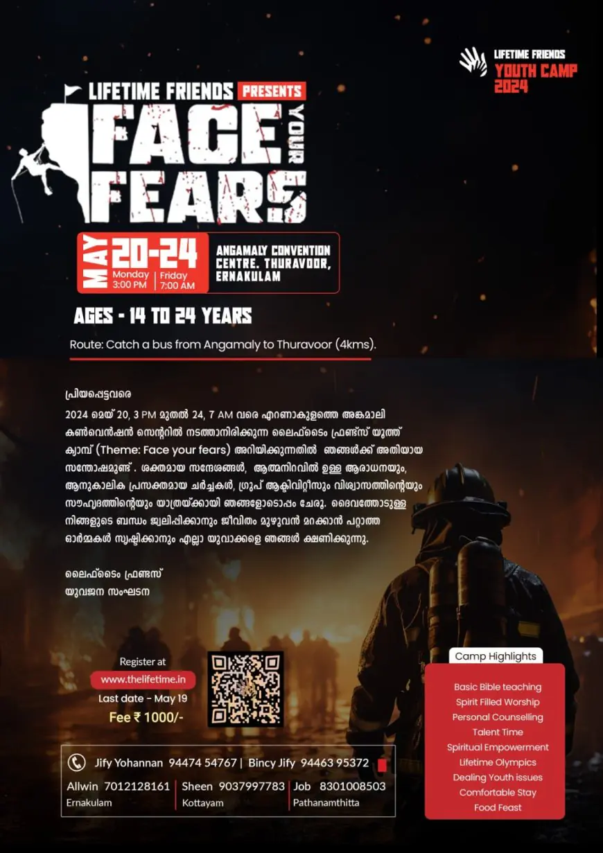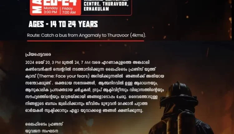 എറണാകുളം : ലൈഫ്ടൈം ഫ്രണ്ട്സ് യുവജന സംഘടനയുടെ ആഭിമുഖ്യത്തിൽ എറണാകുളം അങ്കമാലി കൺവെൻഷൻ സെന്ററിൽ മെയ് 20 (തിങ്കൾ) ഉച്ചയയ്ക്ക് 3 മണി മുതൽ 24 (വെള്ളി) രാവിലെ 7 മണി വരെ ലൈഫ്ടൈം ഫ്രണ്ട്സ് യൂത്ത് ക്യാമ്പ് നടത്തുന്നു. ആത്മീയ സന്ദേശങ്ങൾ, ആരാധന, നിരവധി ഗ്രൂപ്പ് ആക്ടിവിറ്റീസ് എന്നിവ ക്രമീകരിച്ചിരിക്കുന്നു.