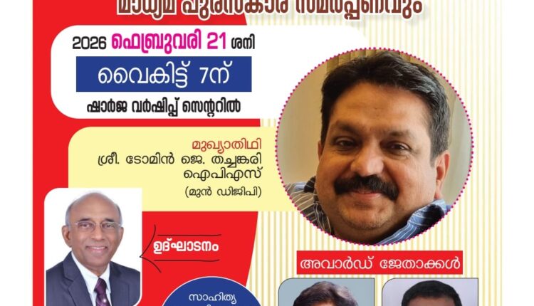 സാഹിത്യ സംഗമവും അവാർഡ് ദാനവും ഇന്ന് വൈകിട്ട് ഷാർജയിൽ : ടോമിൻ ജെ.തച്ചങ്കരി ഐ പി എസ് മുഖ്യാതിഥി