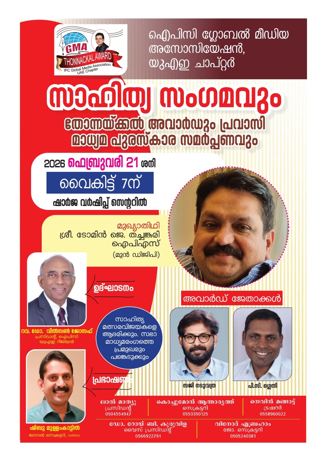 ഷാർജ : ഐപിസി ഗ്ലോബൽ മീഡിയ അസോസിയേഷൻ യുഎഇ ചാപ്റ്ററിൻ്റെ ആഭിമുഖ്യത്തിൽ ഫെബ്രുവരി 21ന് ഷാർജ വർഷിപ്പ് സെന്ററിൽ സാഹിത്യ സംഗമവും തോന്നയ്ക്കൽ അവാർഡും, പ്രവാസി മാധ്യമ പുരസ്കാര സമർപ്പണവും നടക്കും. മുൻ ഡിജിപി ടോമിൻ ജെ.തച്ചങ്കരി ഐപിഎസ് മുഖ്യ പ്രഭാഷണം നടത്തും.