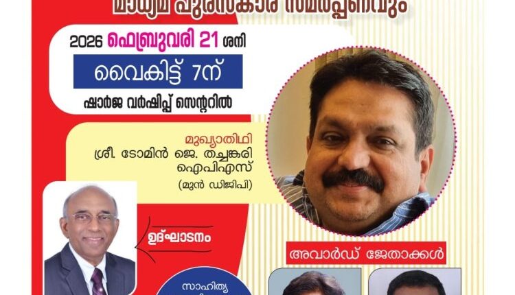 ഷാർജയിൽ ഐ.പി.സി. ഗ്ലോബൽ മീഡിയ അസോസിയേഷന്റെ ആഭിമുഖ്യത്തിൽ ഫെബ്രുവരി 21-ന്f സാഹിത്യ സംഗമവും പുരസ്കാര സമർപ്പണവും നടക്കും. ഷാർജ വർഷിപ്പ് സെന്ററിൽ വൈകിട്ട് 7 മണിക്ക് നടക്കുന്ന സമ്മേളനത്തിൽ മുൻ ഡി.ജി.പി. ടോമിൻ ജെ. തച്ചങ്കരി മുഖ്യപ്രഭാഷണം നടത്തും. കാർട്ടൂണിസ്റ്റ് സജി നടുവത്രയ്ക്ക് തോന്നയ്ക്കൽ സാഹിത്യ പുരസ്കാരവും ‘മന്ന’ ചീഫ് എഡിറ്റർ പി. സി. ഒമ്മെനിക്ക് പ്രവാസി മാധ്യമ പുരസ്കാരവും ചടങ്ങിൽ സമ്മാനിക്കും. റവ. ഡോ. വിൽസൺ ജോസഫ് ഉദ്ഘാടനം ചെയ്യുന്ന യോഗത്തിൽ വിവിധ സഭാ-മാധ്യമ പ്രതിനിധികൾ പങ്കെടുക്കും.