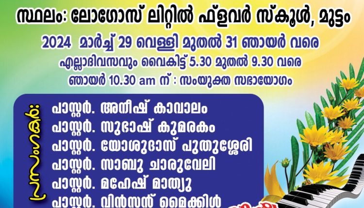 മുട്ടം : 29 മത് ലോഗോസ് ബൈബിൾ കൺവെൻഷൻ മാർച്ച് 29 മുതൽ 31 വരെ മുട്ടം ലോഗോസ് ലിറ്റിൽ ഫ്ലവർ സ്കൂളിൽ വെച്ച് നടത്തപ്പെടും . പാസ്റ്റർമാരായ അനീഷ് കാവാലം , സുഭാഷ് കുമരകം , യേശുദാസ് പുതുശ്ശേരി , സാബു ചാരുവേലി , മഹേഷ് മാത്യു , വിൻസെന്റ് മൈക്കൽ എന്നിവർ ദൈവവചനം പ്രഘോഷിക്കും . ലോഗോസ് സിംഗേഴ്സ് സംഗീത ശുശ്രുഷ നിർവഹിക്കും .31 നു നടക്കുന്ന സംയുക്ത ആരാധനയോടെ കൺവെൻഷൻ സമാപിക്കും.