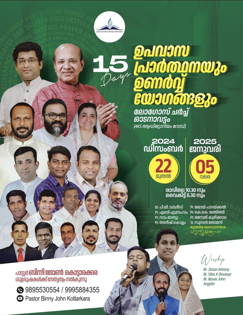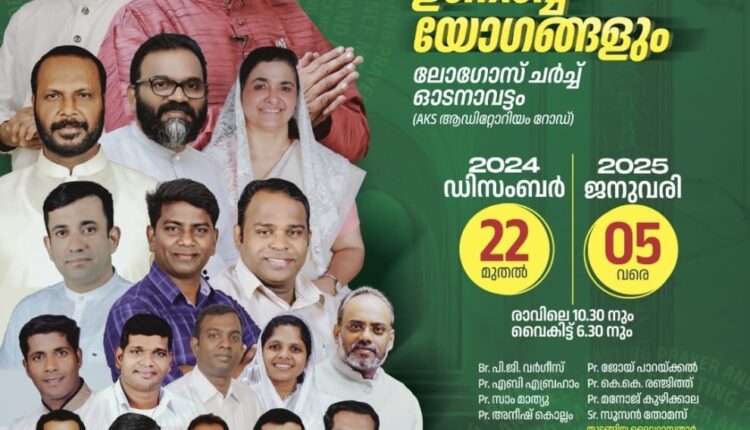 ഓടനാവട്ടം : ലോഗോസ് ഇന്റർനാഷണൽ മിനിസ്ട്രീസിന്റെ ആഭിമുഖ്യത്തിൽ ഡിസംബർ 22 മുതൽ ജനുവരി 5 വരെ ഓടനാവട്ടം ലോഗോസ് ചർച്ചിൽ 15 ദിവസ ഉപവാസ പ്രാർത്ഥനയും ഉണർവ് യോഗങ്ങളും നടക്കും.