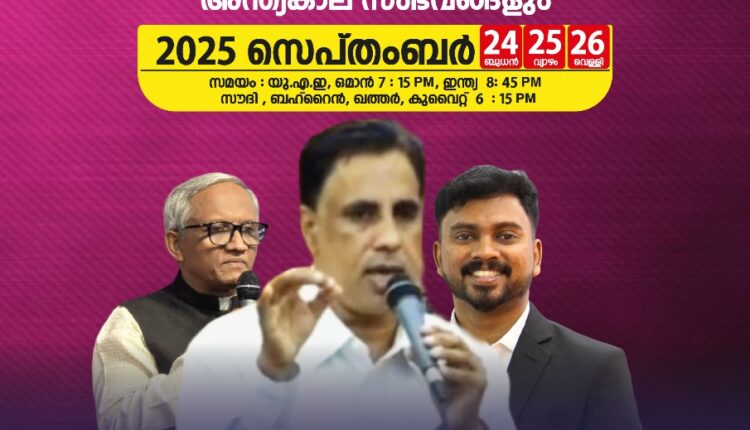 ഷാർജ:മഹനീയം ചർച്ചിന്റെ സുവിശേഷ മഹായോഗം സെപ്റ്റംബർ 24 ബുധൻ മുതൽ 26 വെള്ളി വരെ വൈകിട്ട് 7:15 (യുഎഇ സമയം ) സൂംമിൽ നടത്തപ്പെടുന്നു. പാസ്റ്റർ സാജു ചാത്തന്നൂർ മുഖ്യപ്രഭാഷകൻ ആയിരിക്കും. ക്രിസ്തുവിന്റെ രണ്ടാം വരവും അന്ത്യകാല സംഭവങ്ങളും എന്നതാണ് പ്രസംഗ വിഷയം.പാസ്റ്റർ സി. വി. എബ്രഹാം, റാന്നി സമർപ്പണ പ്രാർത്ഥന നടത്തും. മിസ്പ വർഷിപ്പേഴ്സ് ബഹറിൻ സംഗീത ശ്രൂശൂഷ നടത്തും. Zoom ID 878 7537 9469 PW: 5432tv. കൂടുതൽ വിവരങ്ങൾക്ക്: പാസ്റ്റർ. ബിജു മാത്യു +971 55 418 2953, ബ്രദർ ബിനു പണിക്കർ +971 50 850 2119, ബ്രദർ ഷിജി വർഗീസ് +971 50 383 9157.