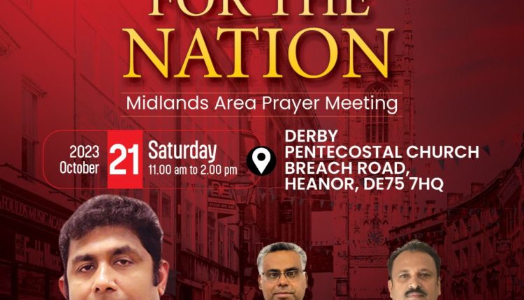എം.പി.എ യുകെ യുടെ ആഭിമുഖ്യത്തിൽ രാജ്യത്തിന്റെ ഉണർവ്വിനായി ഇംഗ്ലണ്ടിലെ അഞ്ച് റീജിയനുകളിൽ നടത്തപ്പടുന്ന ഏകദിന പ്രാർത്ഥനാ സംഗമത്തിന്റെ മൂന്നാം ഘട്ടം ഒക്ടോബർ 21 ശനിയാഴ്ച രാവിലെ 11 മണി മുതൽ വൈകിട്ട് 2 മണിവരെ ഡർബി പെൻ്റകോസ്റ്റൽ ചർച്ചിൽ (മിഡ്ലാൻഡ് റീജിയൻ) നടക്കും.