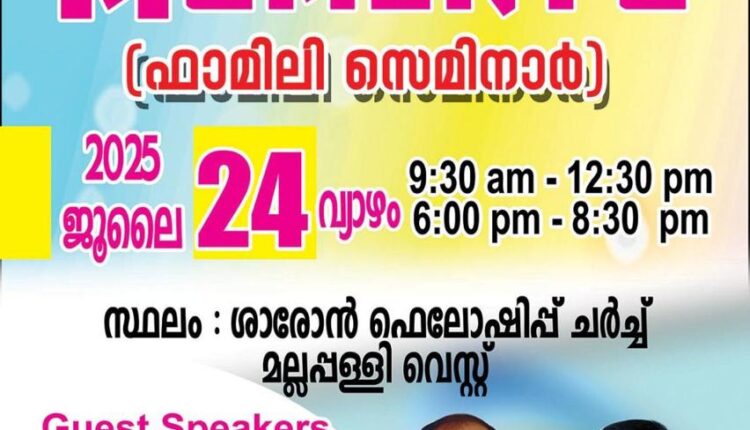മല്ലപ്പള്ളി : ശാരോൻ ഫെലോഷിപ്പ് ചർച്ച് മല്ലപ്പള്ളി വെസ്റ്റ് ( മൂശാരിക്കവല ) സഭയുടെ നേതൃത്വത്തിൽ ഫാമിലി സെമിനാർ 2025 ജൂലൈ 24 നു നടക്കുന്നു.