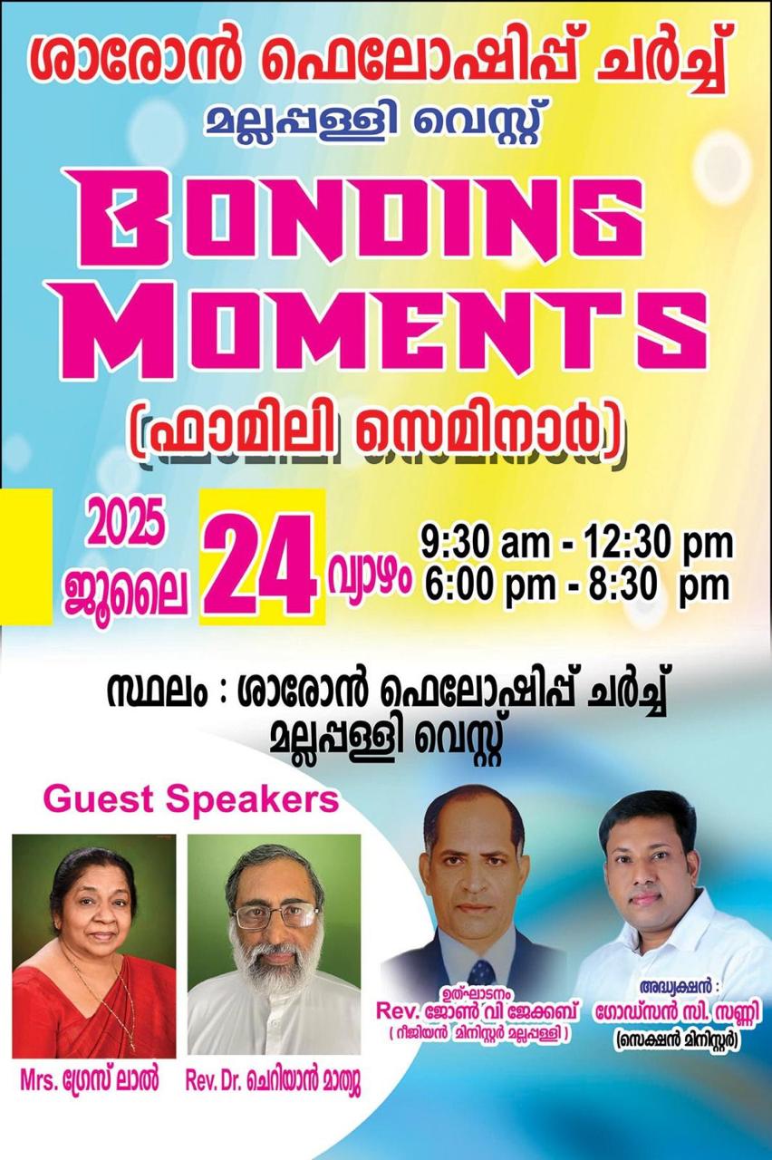 ബോണ്ടിങ് മൊമന്റ്സ് എന്ന പേരിൽ കുടുംബ ബന്ധങ്ങളുടെ ഊഷ്മളത നിലനിർത്തുക എന്ന ലക്ഷ്യത്തോട് നടത്തുന്ന ഫാമിലി സെമിനാറിൽ പ്രശസ്ത സൈക്കോളജിസ്റ്റുകളായ Dr. ഗ്രെയ്സ് ലാൽ, Rev. Dr. ചെറിയാൻ മാത്യു എന്നിവർ ക്ലാസുകൾ നയിക്കും. ശാരോൻ ഫെലോഷിപ്പ് സഭയുടെ മല്ലപ്പള്ളി റീജിയൻ പ്രസിഡന്റ് Rev. ജോൺ വി ജേക്കബ് ഉത്ഘാടനം നിർവഹിക്കുന്നതും മല്ലപ്പള്ളി വെസ്റ്റ് സെക്ഷൻ പ്രസിഡന്റ് പാസ്റ്റർ ഗോഡ്സൻ സി സണ്ണി അധ്യക്ഷത വഹിക്കുന്നതും ആയിരിക്കും.