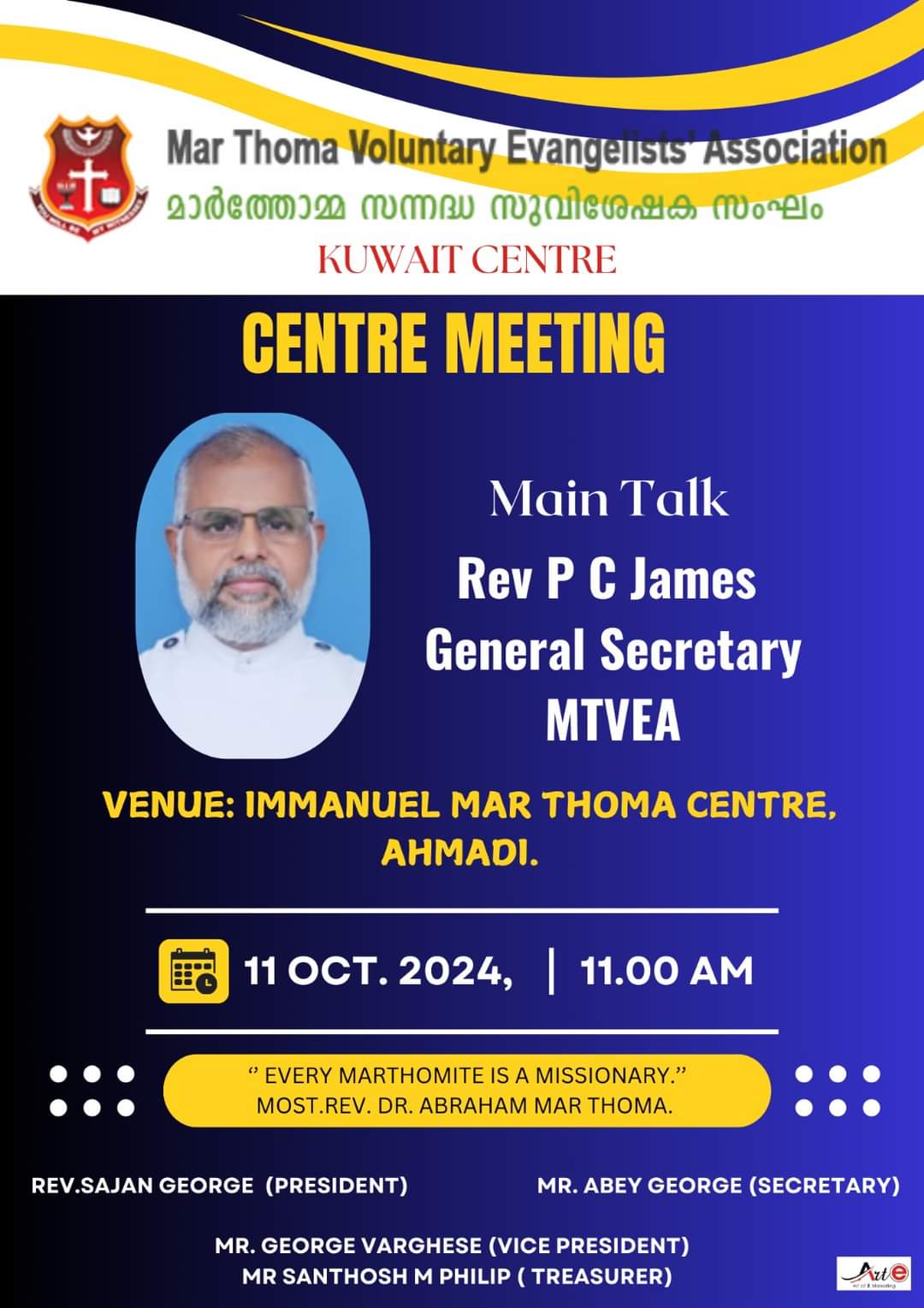 കുവൈറ്റ് : മാർത്തോമ്മ സന്നദ്ധ സുവിശേഷക സംഘം കുവൈറ്റ് സെന്ററിന്റെ ആഭിമുഖ്യത്തിൽ ഒക്ടോബർ 11 ന് അഹമ്മദി ഇമ്മാനുവൽ മാർത്തോമ്മാ സെൻ്ററിൽ സെന്റർ മീറ്റിംഗ് നടക്കും. റവ. പി. സി. ജെയിംസ് പ്രസംഗിക്കും. റവ. സാജൻ ജോർജ്, എബി ജോർജ്, ജോർജ് വർഗീസ്, സന്തോഷ് എം. ഫിലിപ്പ് എന്നിവർ നേതൃത്വം നൽകും.