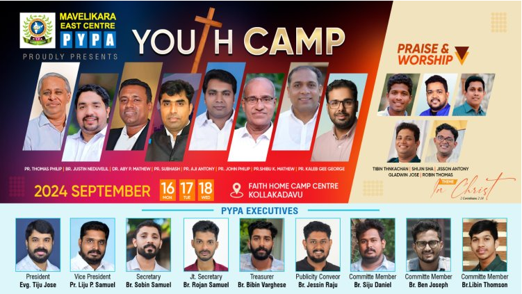 മാവേലിക്കര : മാവേലിക്കര ഈസ്റ്റ് സെന്റർ പിവൈപിഎയുടെ ആഭിമുഖ്യത്തിൽ സെപ്റ്റംബർ 16 മുതൽ 18 വരെ കൊല്ലകടവ് ഫെയ്ത്ത്ഹോം ക്യാമ്പ് സെന്ററിൽ യുവജന ക്യാമ്പ് നടക്കും.