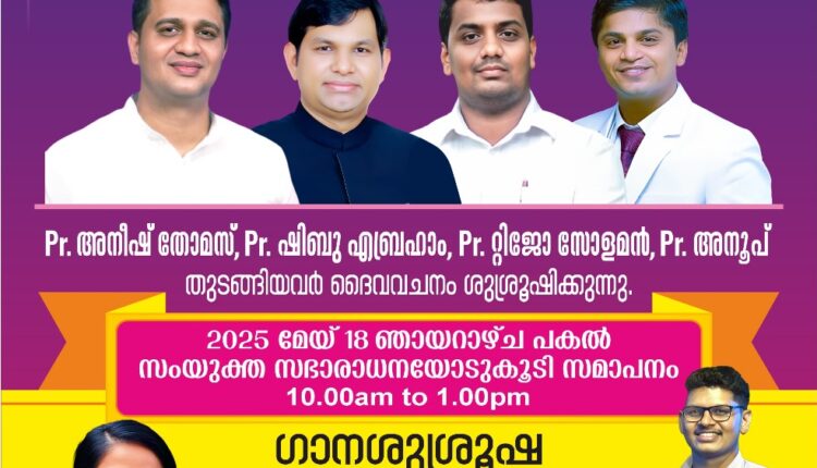 യോഗത്തിൽ പാസ്റ്റർമാരായ അനീഷ് തോമസ്, ഷിബു എബ്രഹാം, ടിജോ സോളമൻ, അനൂപ് എന്നിവർ പ്രസംഗിക്കും. സിസ്റ്റർ ഫെബ ലിജോ, പാ. ഗ്രേസെൻ പീറ്റർ എന്നിവർ ഗാന ശുശ്രൂഷ നിർവഹിക്കും. 18 ഞായറാഴ്ച നടക്കുന്ന സംയുക്ത ആരാധനയോടെ കൺവെൻഷൻ സമാപിക്കും.