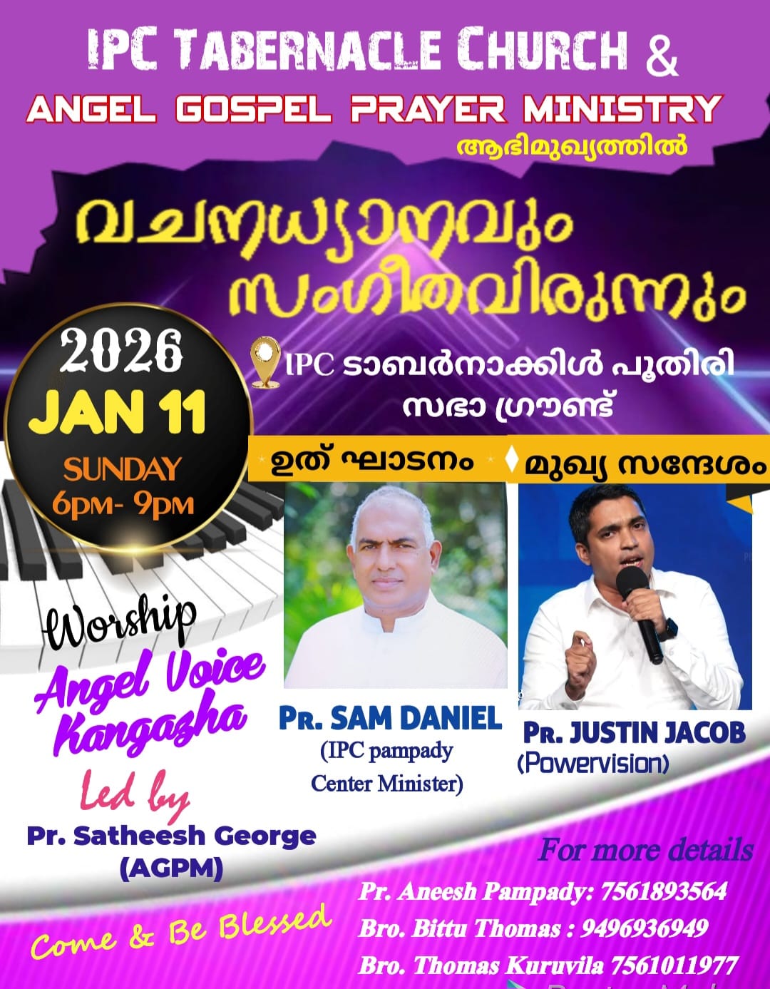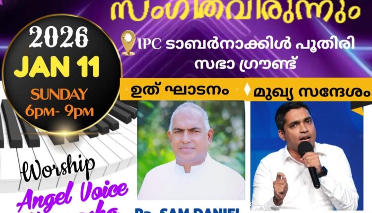 ഐപിസി ടാബർനാക്കിൾ പൂതിരി സഭയും ഏഞ്ചൽ ഗോസ്പൽ പ്രയർ മിനിസ്ട്രി ചേർന്ന് നാളെ (11.1.2026) ഞായർ 6 പിഎം മുതൽ നടത്തുന്നതാണ്.