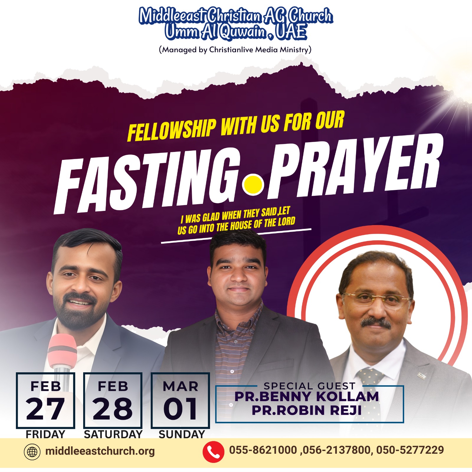 ഉമ്മുൽ ഖുവൈൻ: മിഡിൽ ഈസ്റ്റ് ക്രിസ്റ്റ്യൻ എ.ജി ചർച്ചിന്റെ ആഭിമുഖ്യത്തിൽ ഫെബ്രുവരി 27 മുതൽ മാർച്ച് 1 വരെ ഉമ്മുൽ ഖുവൈനിൽ മൂന്ന് ദിവസം നീണ്ടുനിൽക്കുന്ന ഉപവാസ പ്രാർത്ഥന നടക്കും. ക്രിസ്റ്റ്യൻലൈവ് മീഡിയ മിനിസ്ട്രിയുടെ മേൽനോട്ടത്തിലാണ് പ്രാർത്ഥന ക്രമീകരിച്ചിരിക്കുന്നത്. പാ. ബെന്നി കൊല്ലം, പാ. റോബിൻ റെജി എന്നിവർ പ്രസംഗിക്കും. ബ്രദർ അജി ജോർജ് ശുശ്രൂഷകൾക്ക് നേതൃത്വം നൽകും.