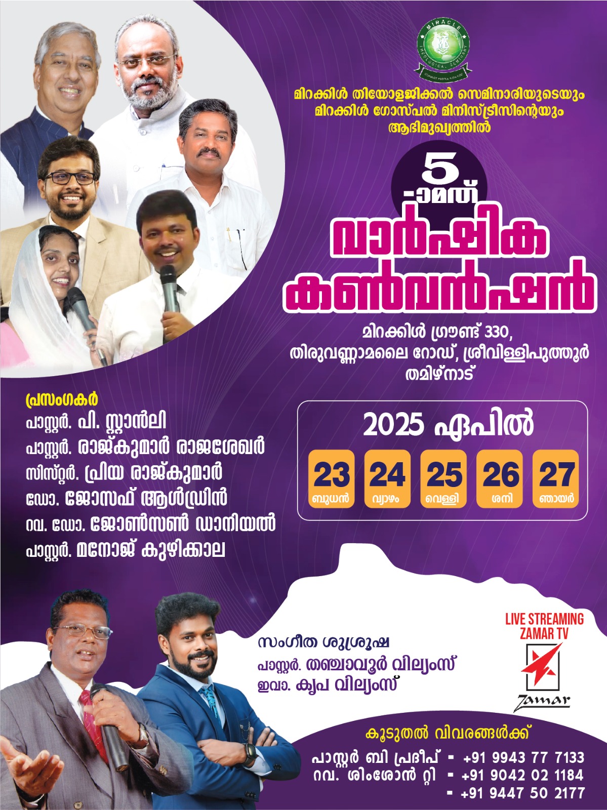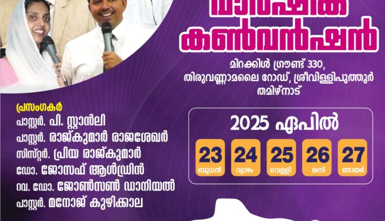 ശ്രീവിള്ളിപുത്തൂർ : മിറക്കിൾ തിയോളജിക്കൽ സെമിനാരിയുടെയും മിറക്കിൾ ഗോസ്പൽ മിനിസ്ട്രീസിന്റെയും ആഭിമുഖ്യത്തിൽ ഏപ്രിൽ 23 മുതൽ 27 വരെ ശ്രീവിള്ളിപുത്തൂർ മിറക്കിൾ ഗ്രൗണ്ടിൽ 5 -മത് വാർഷിക കൺവെൻഷൻ നടക്കും.