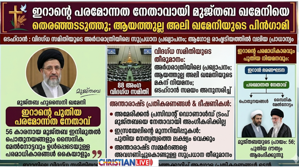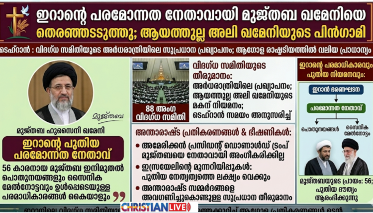 ഇറാൻ : ഇറാന്റെ പരമോന്നത നേതാവായിരുന്ന ആയത്തുല്ല അലി ഖമേനിയുടെ പിൻഗാമിയായി അദ്ദേഹത്തിന്റെ രണ്ടാമത്തെ മകൻ മുജ്തബ ഹുസൈനി ഖമേനിയെ തെരഞ്ഞെടുത്തു. ഇറാനിലെ 88 അംഗ വിദഗ്ധ സമിതിയാണ് ടെഹ്റാൻ സമയം അർധരാത്രിയോടെ ഈ സുപ്രധാന പ്രഖ്യാപനം നടത്തിയത്. 56 കാരനായ മുജ്തബ ഖമേനി ഇറാന്റെ ഭരണഘടനയനുസരിച്ച് ഇനിമുതൽ രാജ്യത്തിന്റെ പൊതുനയങ്ങളും സൈനിക മേൽനോട്ടവും ഉൾപ്പെടെയുള്ള പരമാധികാരങ്ങൾ കൈയാളും.