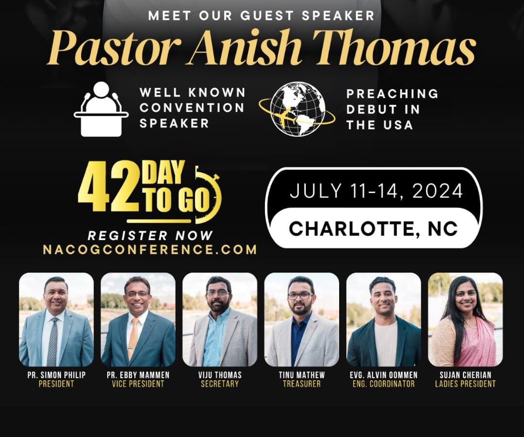 ജൂലൈ 11 മുതൽ 14 വരെ ഷാർലെറ്റിലാണ് സമ്മേളനം ക്രമീകരിക്കുന്നത്. ദൈവത്തിന്റെ, അളക്കുവാൻ കഴിയാത്ത അത്യന്ത ശക്തിയാൽ നിറയുക എന്നതാണ് സമ്മേളനത്തിന്റെ ആപ്ത വാക്യം. പാ അനീഷ് തോമസ് പ്രസംഗിക്കുന്നു.